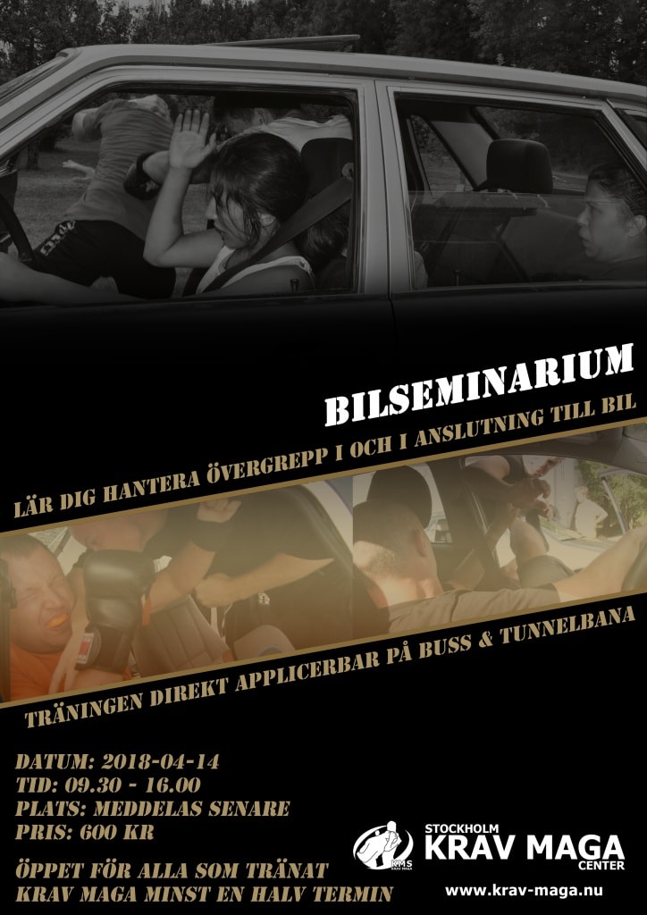 2018-04-14. Endagsseminarium med fokus på försvar mot övergrepp i och i anslutning till bil och allmänna transportmedel. Seminariet är öppet för alla intresserade som tränat minst en halv termin modern Krav Maga och lämpar sig därför väl både för nybörjare och rutinerade utövare.