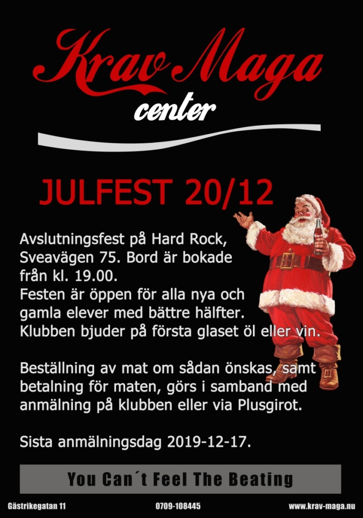 Avslutningsfest 2019-12-20 på Hard Rock Café på Sveavägen 75 med inmundigande av mat och dryck. Bord är bokade på fredagen från 19.00. Tillställningen är öppen för alla nuvarande och tidigare tränande med sina respektive. Klubben bjuder på första glaset öl, vin eller cider.