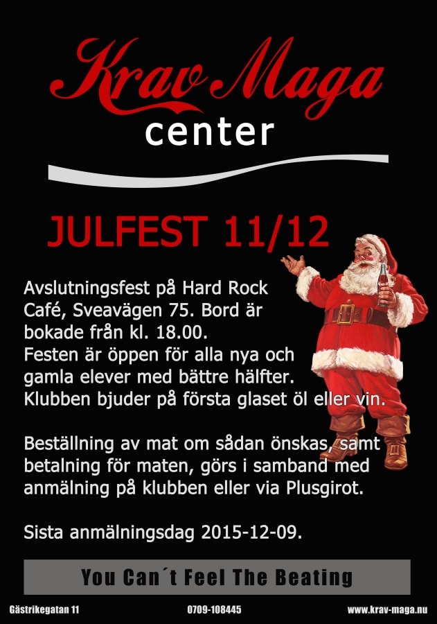 Avslutningsfest 2015-12-11 på Hard Rock Café på Sveavägen 75 med inmundigande av mat och dryck. Bord är bokade på fredagen från 18.00. Festen är öppen för alla nuvarande och tidigare tränande med sina respektive oavsett klubbtillhörighet. Klubben bjuder på första glaset öl eller vin.