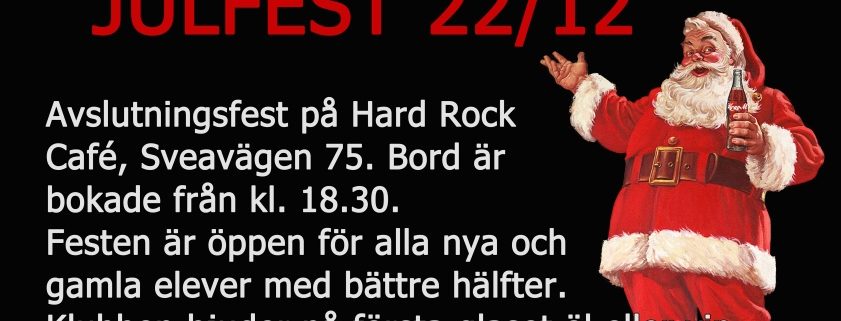 Avslutningsfest 2016-12-22 på Hard Rock Café på Sveavägen 75 med inmundigande av mat och dryck. Bord är bokade på torsdagen från 18.30. Festen är öppen för alla nuvarande och tidigare tränande med sina respektive. Klubben bjuder på första glaset öl, vin eller cider.